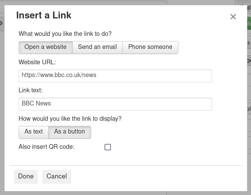 This will then insert a full width button. In the App is displays like this, the colour of the button will match the theme colour of your app.